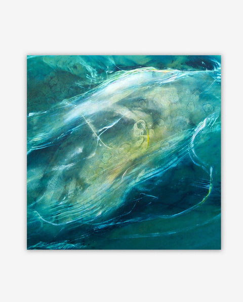 Die Befreiung von frühen bildhaften Vorstellungen erfolgt durch eine Drehung der Leinwand. Eine neue Perspektive eröffnet sich. Diese wird mit lasierenden Farbaufträgen in Weiß und Türkistönen verstärkt.