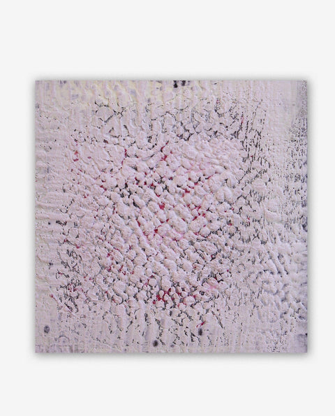 Gezielte Aufspritzungen auf den Mittelpunkt des Malgrundes definieren einen Bildschwerpunkt und erzeugen spontane Strukturen mit besonderer Leichtigkeit. Der folgende Auftrag mit opakem Titaniumweiß macht auch feinste Strukturen sichtbar und kontrastiert mit den dunklen Vertiefungen der unteren Schicht. Gekonnt nutzt die Künstlerin zudem den Materialabtrag mit einer Rasierklinge, welcher durch die flächige Einrahmung den Bildschwerpunkt betont und der Komposition weitere Strukturen und Farbdifferenzierungen hinzufügt.