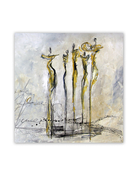 Doch auch das Markenzeichen der Künstlerin, die elegante Schrift, darf auch in dieser Arbeit nicht fehlen. Ausdrucksstark und schwungvoll unterstreicht diese die Dynamik auf dem Malgrund und bringt die gesamte Bildkomposition ins Gleichgewicht. Figur und Schrift scheinen hier auf dem marmorierten Parket des Malgrundes zu tanzen und erzeugen so ein ausdrucksstarkes Werk mit viel Leichtigkeit.