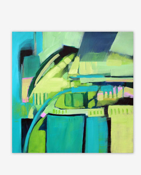 In diesem Online-Kurs arbeitet Helga Budde-Engelke mit monochromen Farben in Grün. Sie beginnt mit einer dunklen Untermalung in Acryl aus drei verschiedenen Grüntönen und setzt darauf Flächen und Formen mit unterschiedlichen Grün-Weißmischungen.