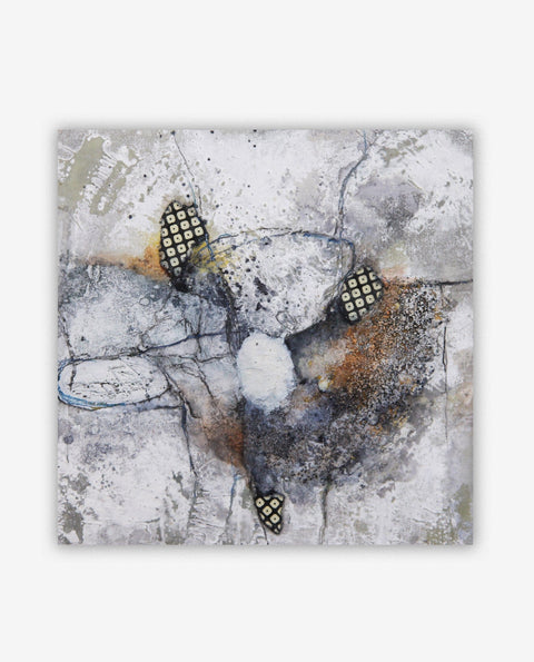 Gemusterte Formen erweitern die Bildkomposition und werden durch lineare Gesten verstärkt und verbunden. Doch das Geheimnis dieser spannungsvollen Arbeit liegt auch im Spiel von Zufälligkeit und Technik. Das, was entstehen möchte, darf wachsen. Auf kleinem Format entsteht so ein ausdrucksstarkes Materialbild mit ganz eigener Bildsprache.