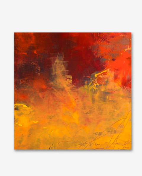 Stück für Stück setzt die Berliner Künstlerin Farbflächen auf eine schwarz grundierte Leinwand und gibt damit grob die Komposition vor. Verschiedene Rottöne werden mit einem kräftigen Orange kontrastiert. Für den Farbauftrag verwendet sie hochwertige Künstlerfarben, die sie zum Teil eher deckend, zum Teil aber auch lasierend mit dem Pinsel aufträgt. Auch ein Malmesser kommt zum Einsatz. Das Schwarz des Untergrundes wird so mühelos in das Farbenspiel einbezogen.
