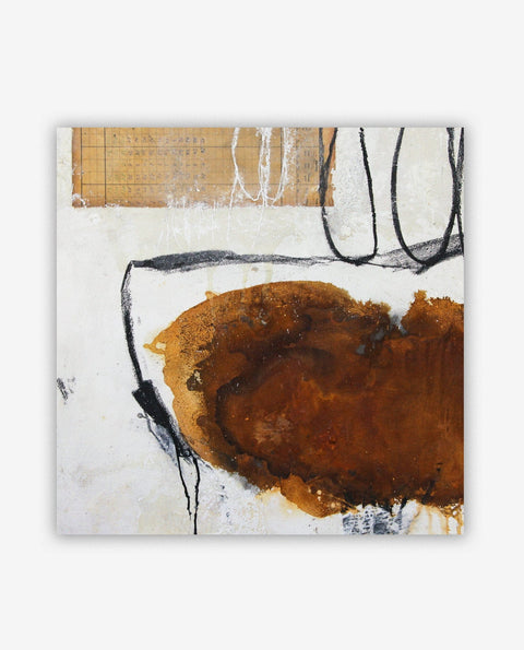 Wachs und Rost auf einem hellen Malgrund sind die Hauptdarsteller dieses Materialmixes. So bietet die Weite des Malgrundes Raum für kontrastreiche Formen und dynamische Strukturen. Zeichnerische Elemente stützen und verbinden Flächen, die dem Rhythmus von Werden und Vergehen unterworfen sind.
